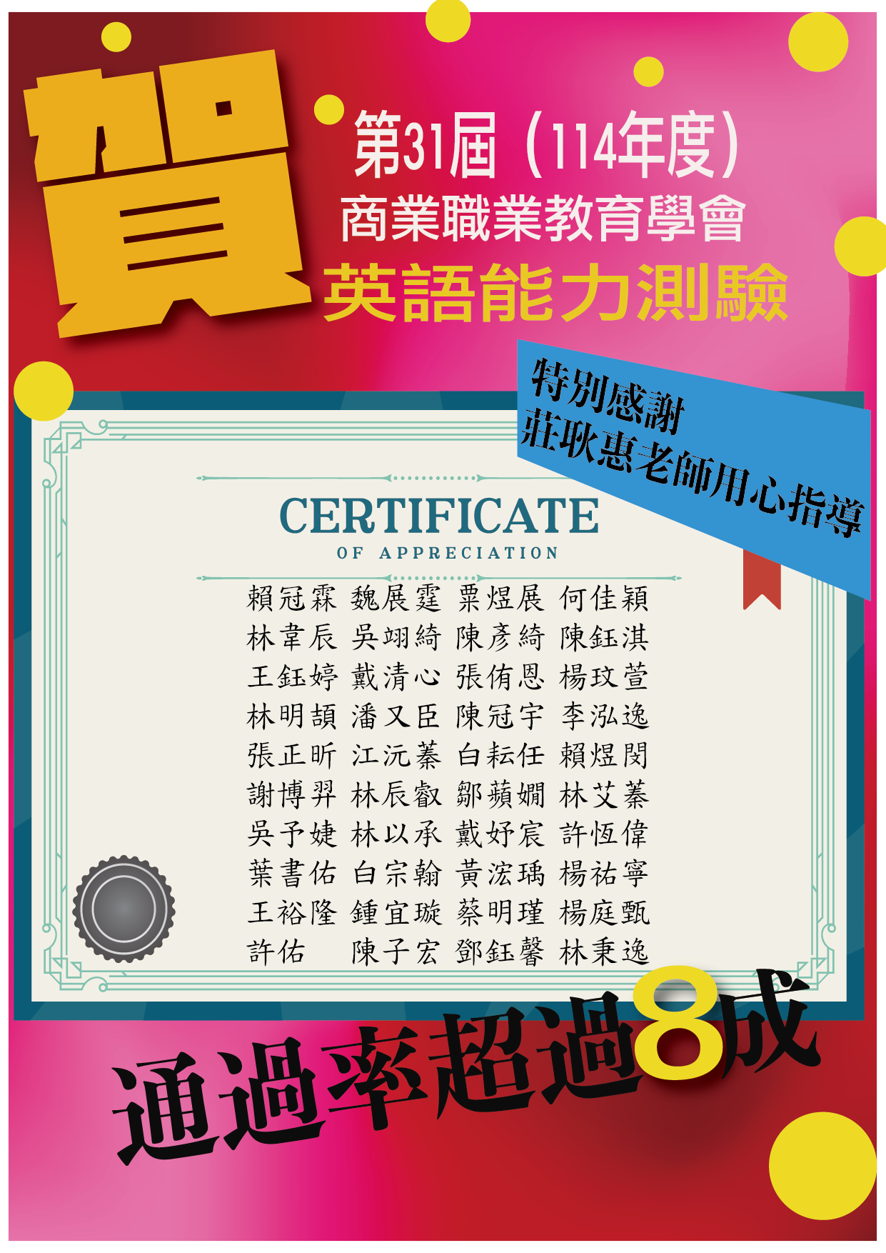 【教務處公告】賀本校同學參加商業職業教育學會英語能力測驗 通過率超過8成~